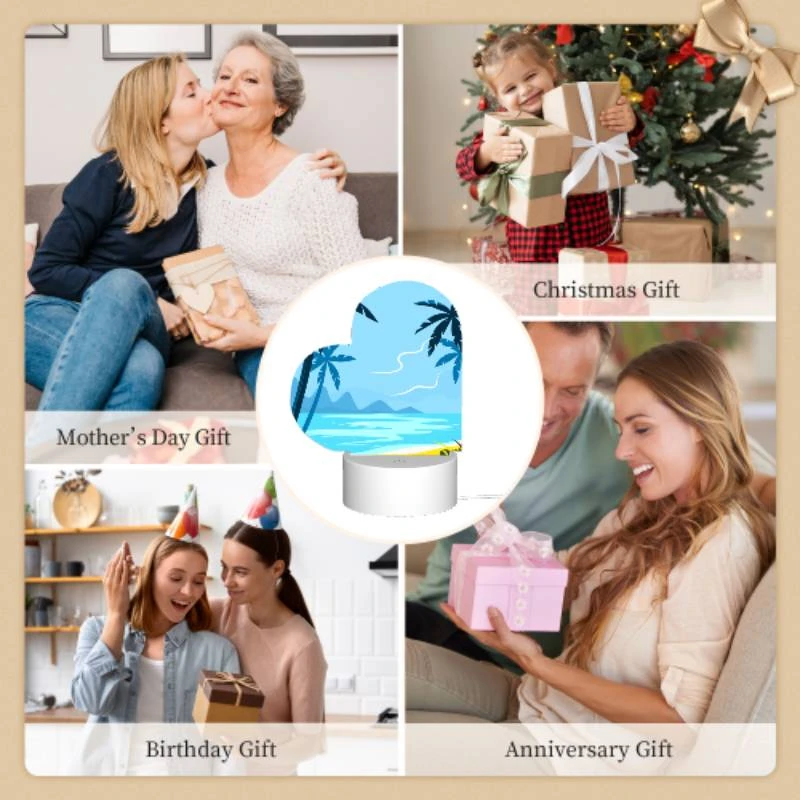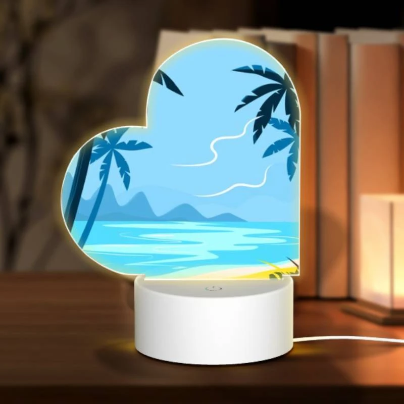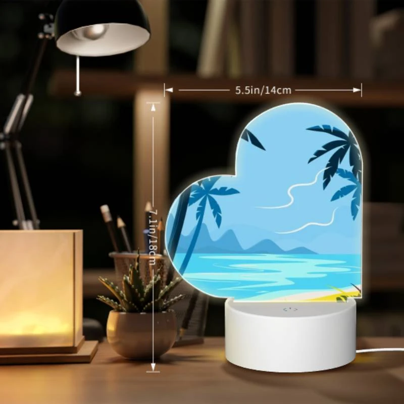 Love Acrylic Night Light, A Blue And Yellow Beach Scene With Palm Trees And A Mountain In The Background.