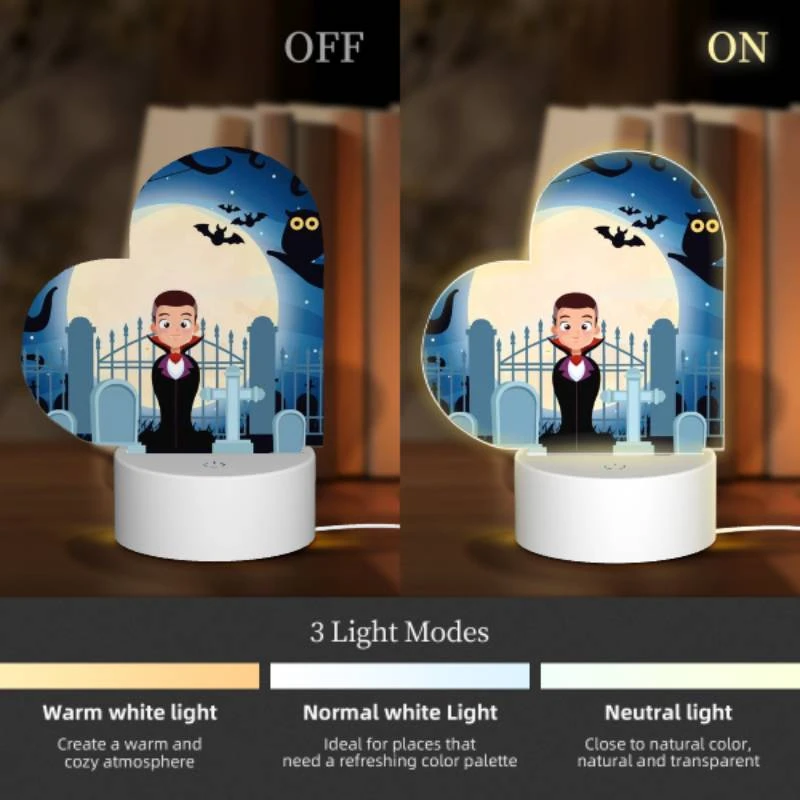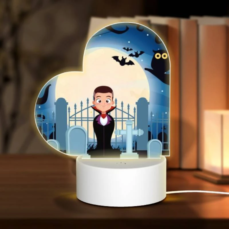 Love Acrylic Night Light, A Boy In A Vampire Costume Stands In Front Of A Fence With A Cemetery In The Background.