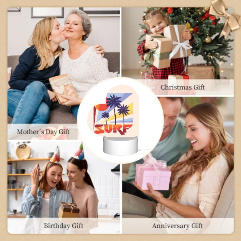 Love Acrylic Night Light, A Colorful Surfboard Logo With A Sun And Palm Trees.