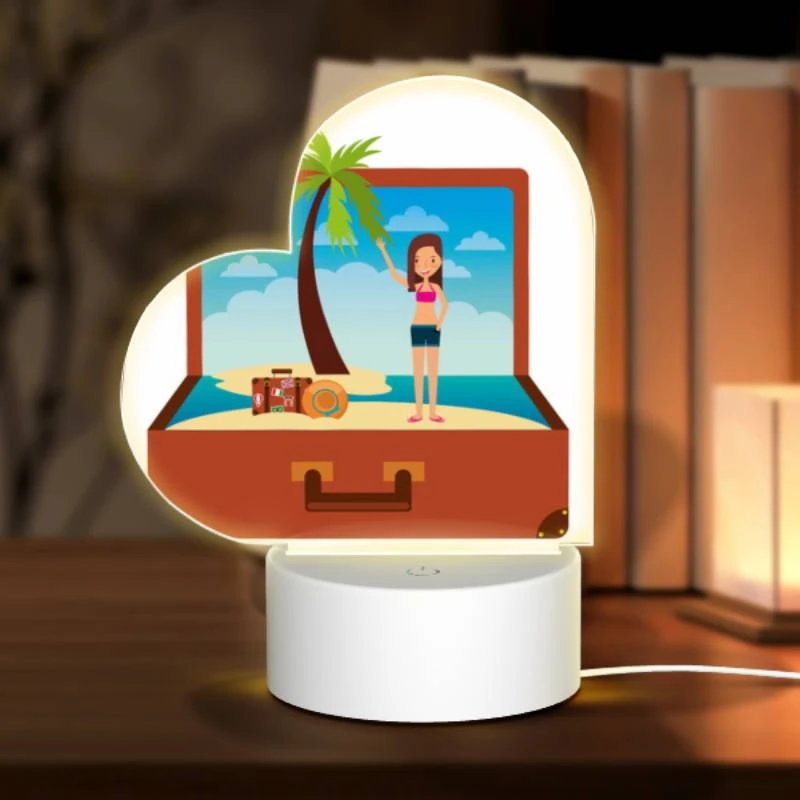 Love Acrylic Night Light, A Woman Is Standing On A Beach With A Suitcase And A Palm Tree.