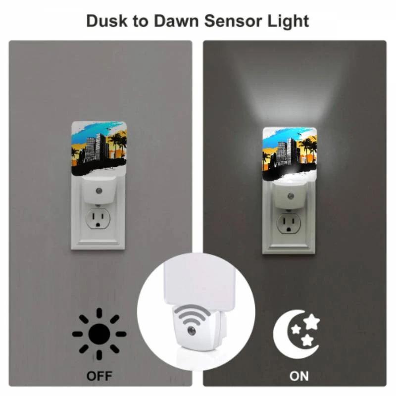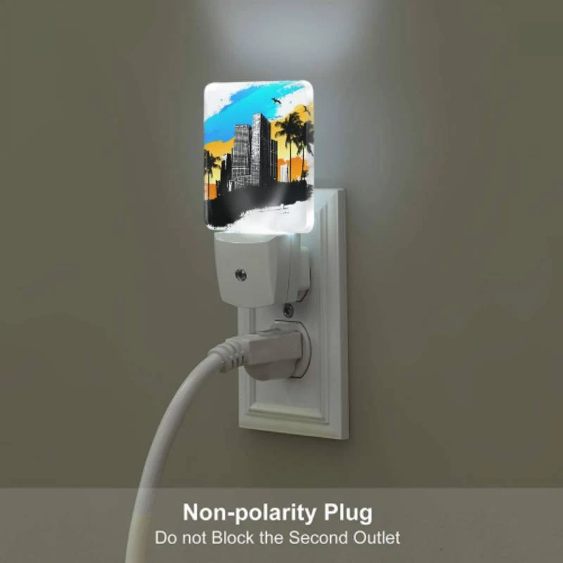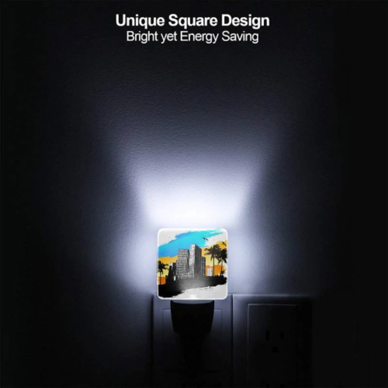 Night Light Set Of 2, A Black And White Drawing Of A City With A Bird Flying Above It.