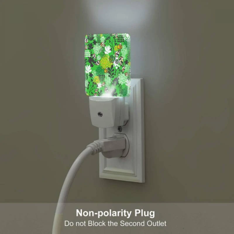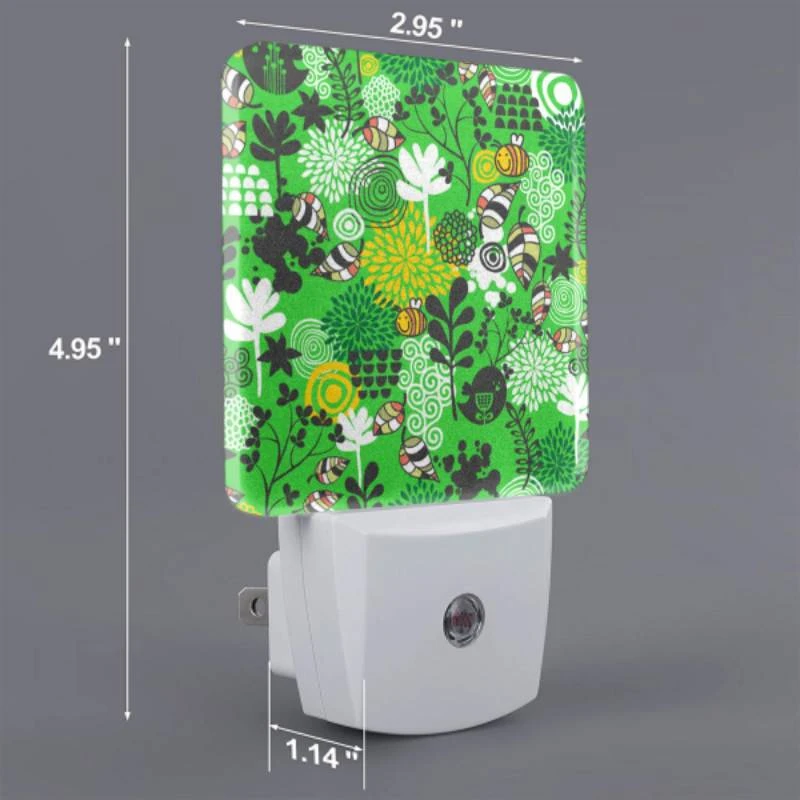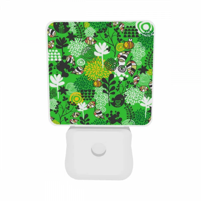 Night Light Set Of 2, A Green And Yellow Floral Pattern With Bees And Flowers.