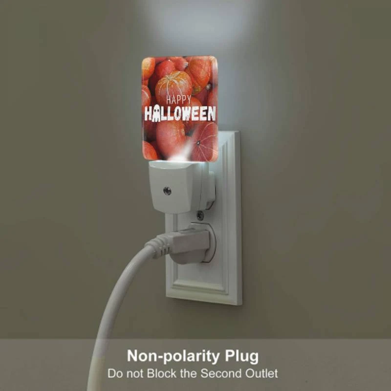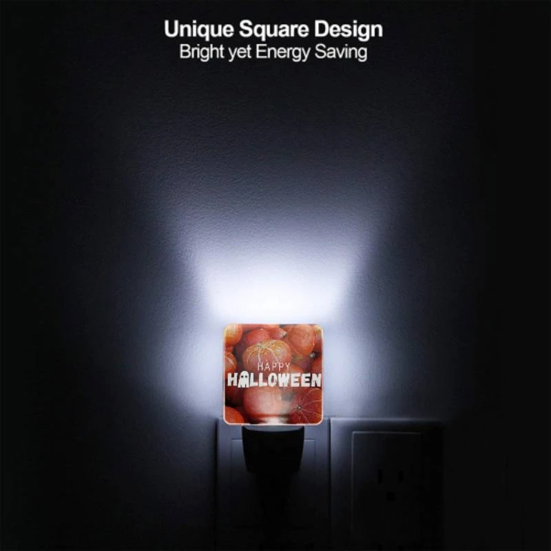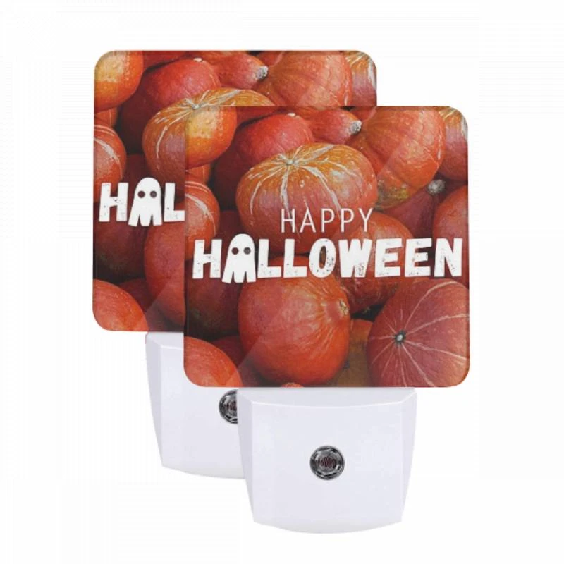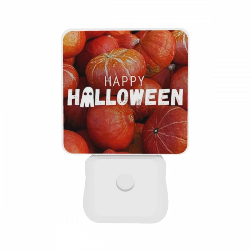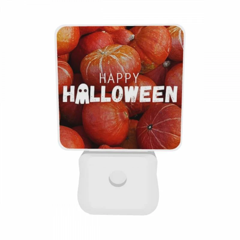 Night Light Set Of 2, A Pile Of Red And Orange Squash With A Caption That Reads “Happy Halloween.”
