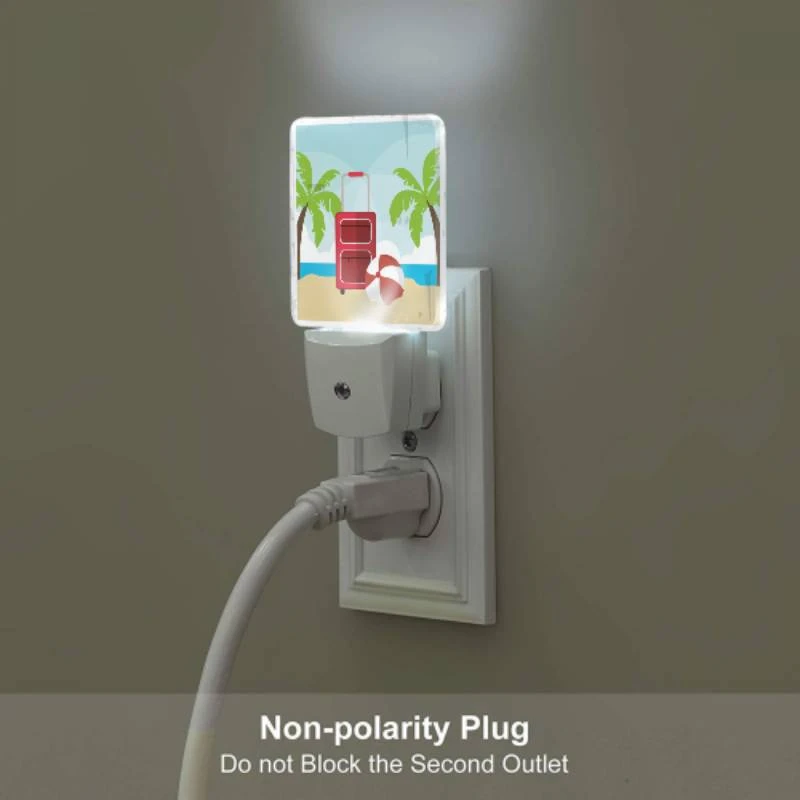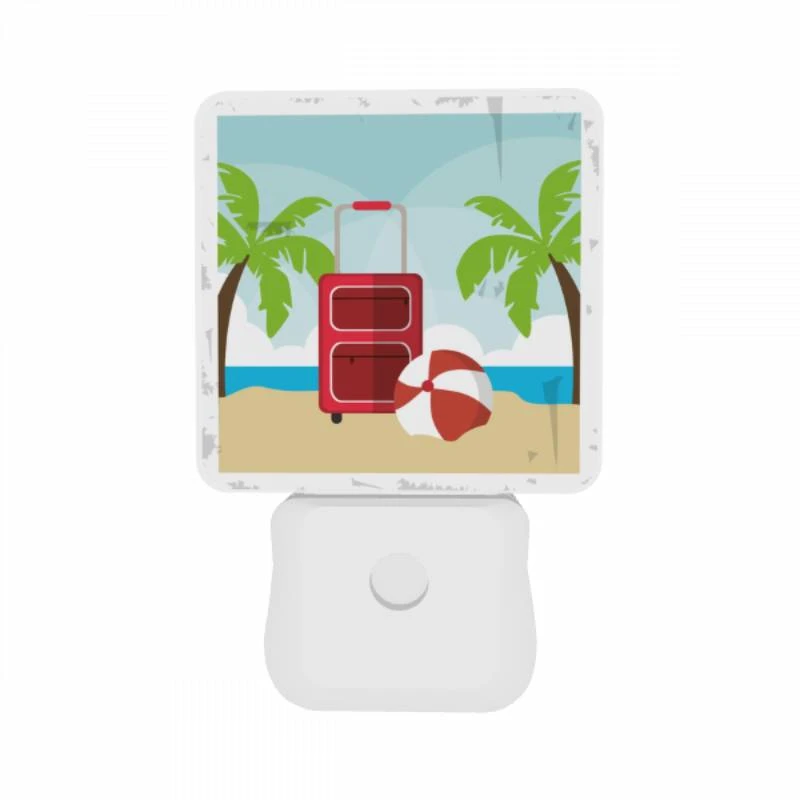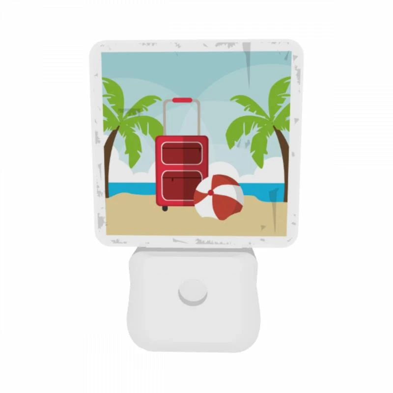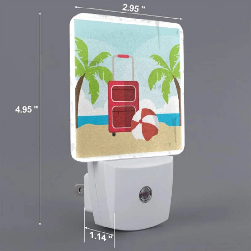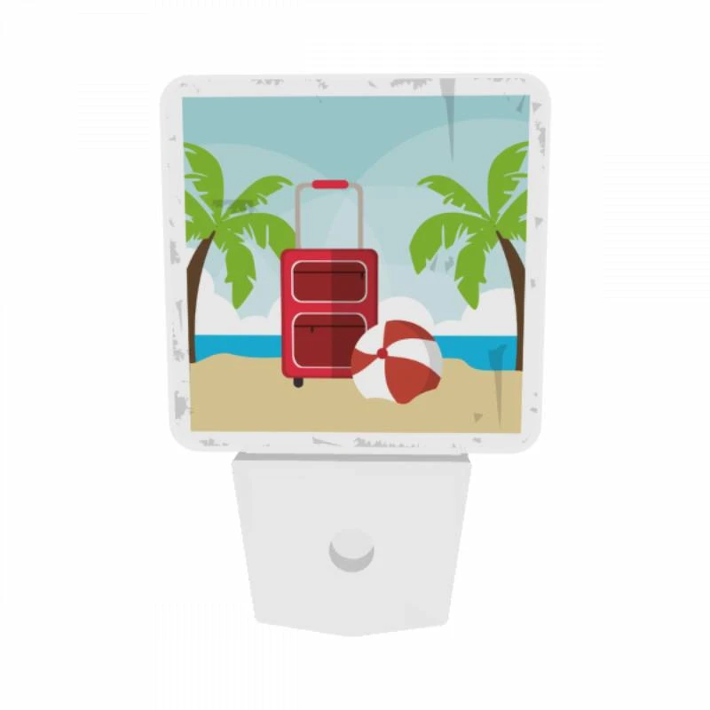 Night Light Set Of 2, A Red Suitcase Is Sitting On A Beach Next To A Red And White Umbrella.