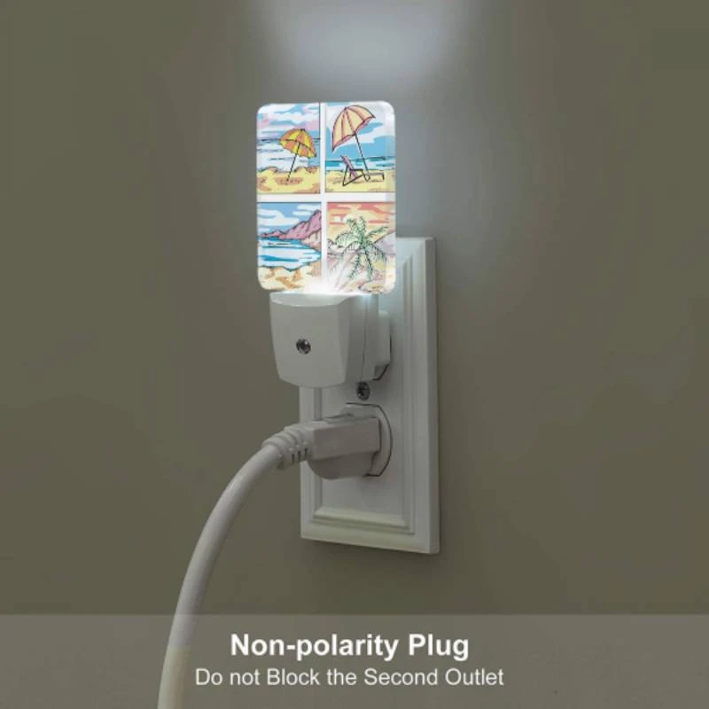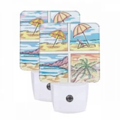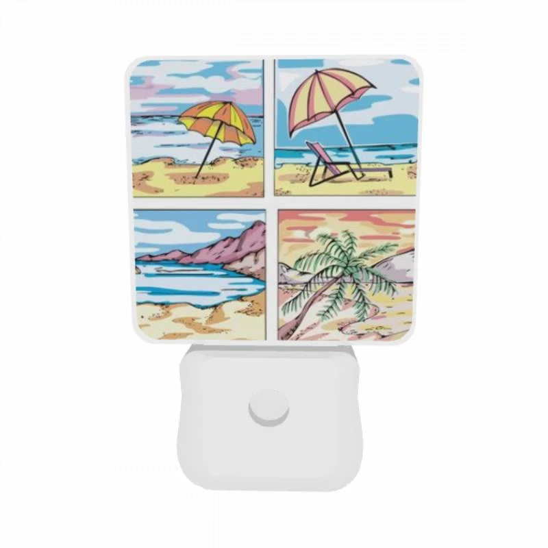 Night Light Set Of 2, A Series Of Four Pictures Of A Beach With Umbrellas And Chairs.