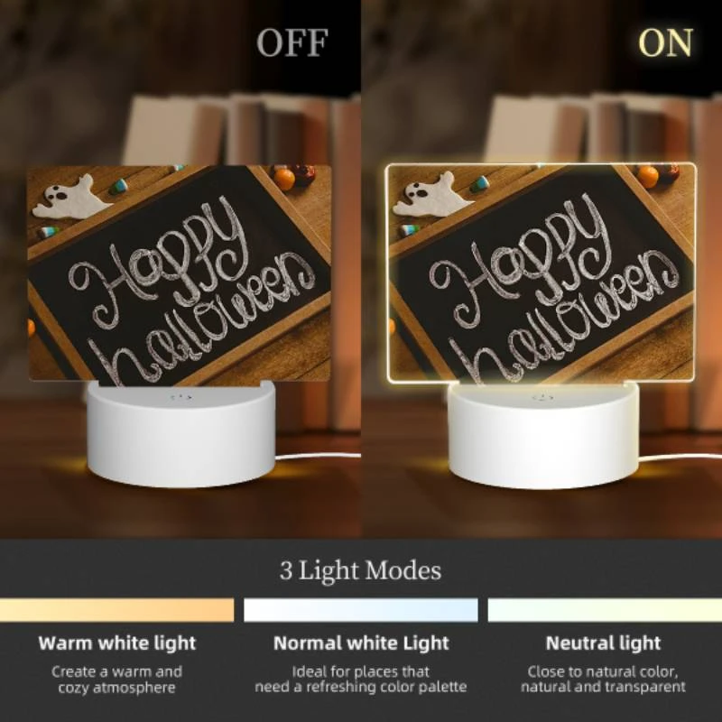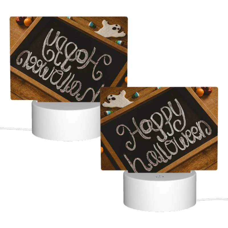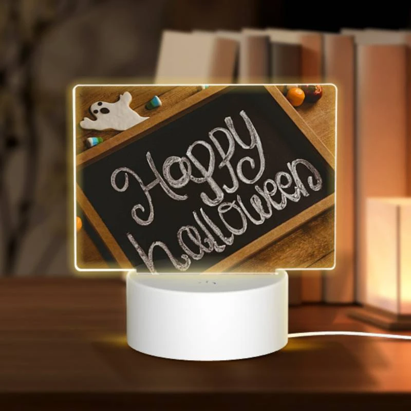 Rectangular Acrylic Night Light, A Chalkboard With The Words “Happy Halloween” Written On It.