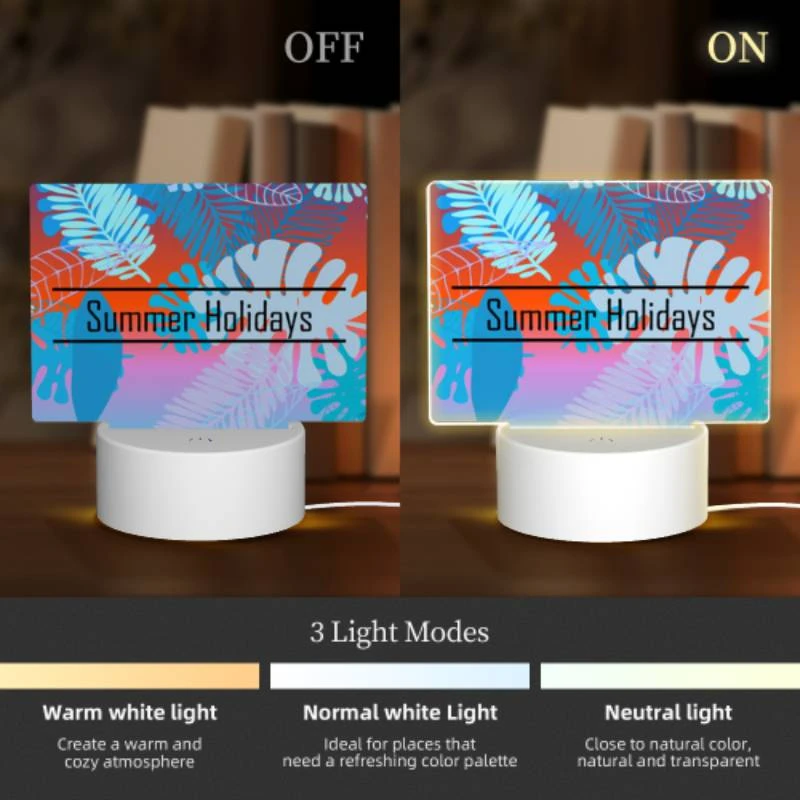 Rectangular Acrylic Night Light, A Colorful Image Of Leaves And A Word “Summer Holidays” Written In The Middle.