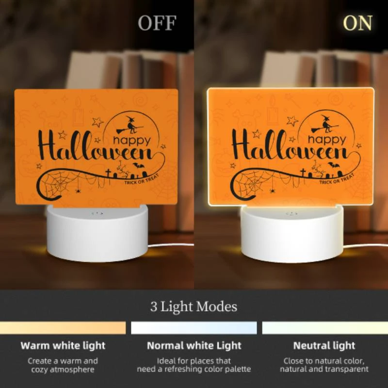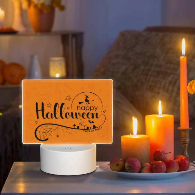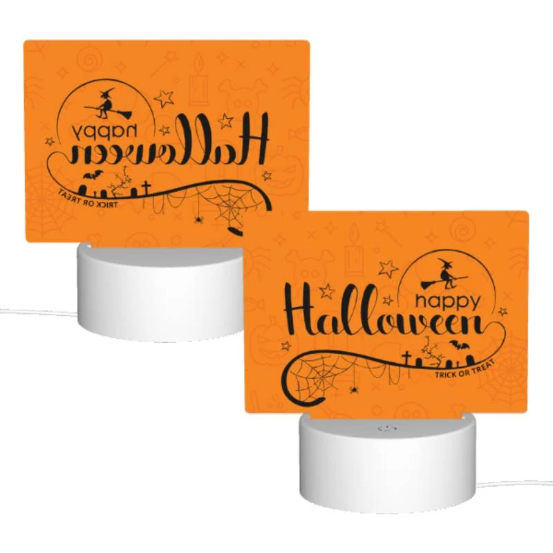 Rectangular Acrylic Night Light, A Colorful Orange Sign That Says “Happy Halloween” With A Witch On A Broom.