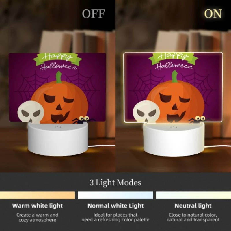 Rectangular Acrylic Night Light, A Happy Halloween Sign With A Pumpkin And A Skeleton.
