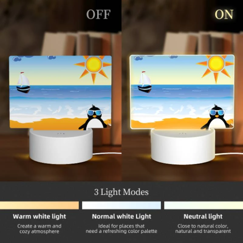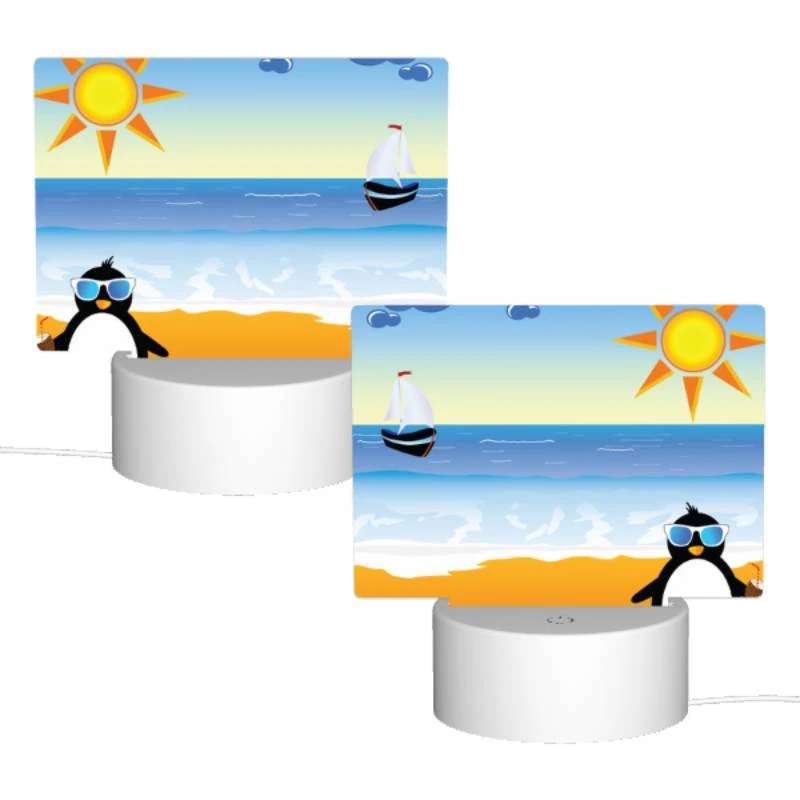 Rectangular Acrylic Night Light, A Penguin Is Standing On A Beach With A Suitcase And Sunglasses.