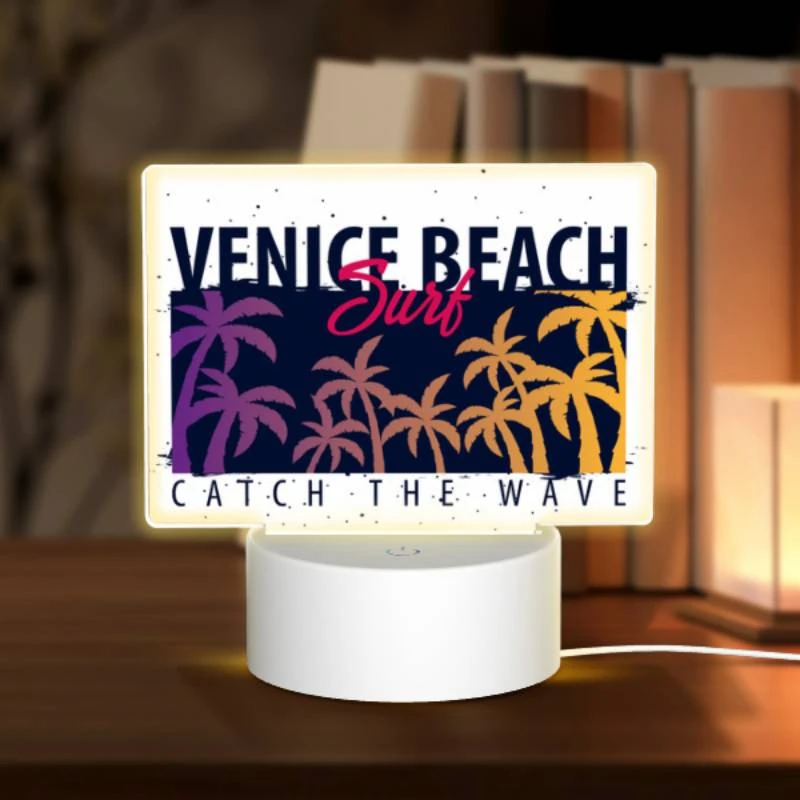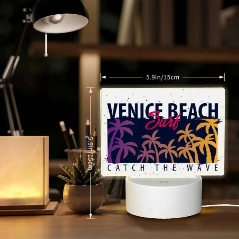 Rectangular Acrylic Night Light, A Surfboard With A Picture Of A Beach And The Words “Catch The Wave” On It.