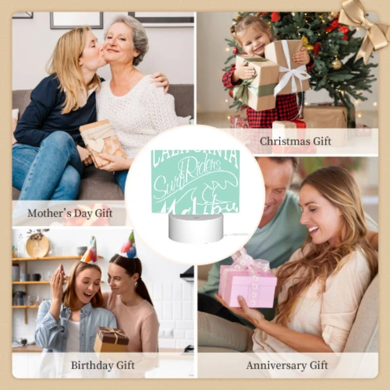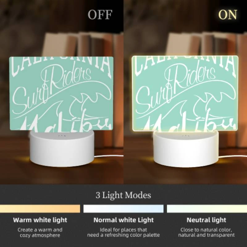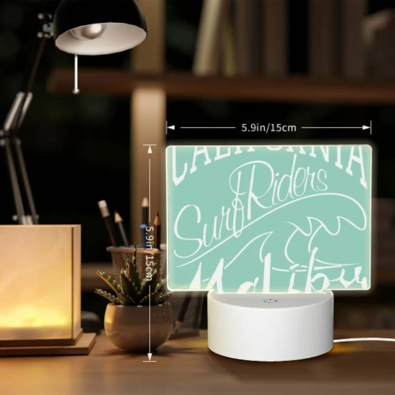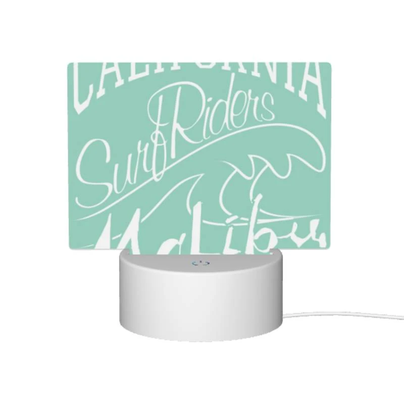 Rectangular Acrylic Night Light, A Surfboard With The Words California Riders Surf Surf Surf On It.