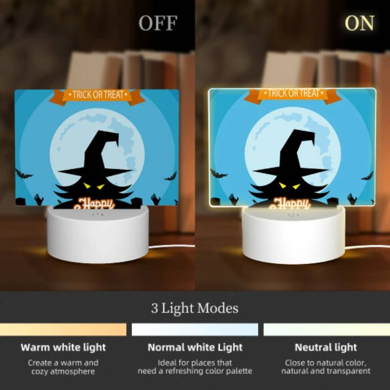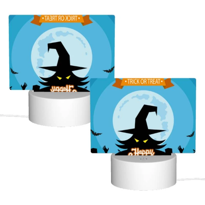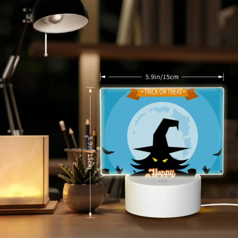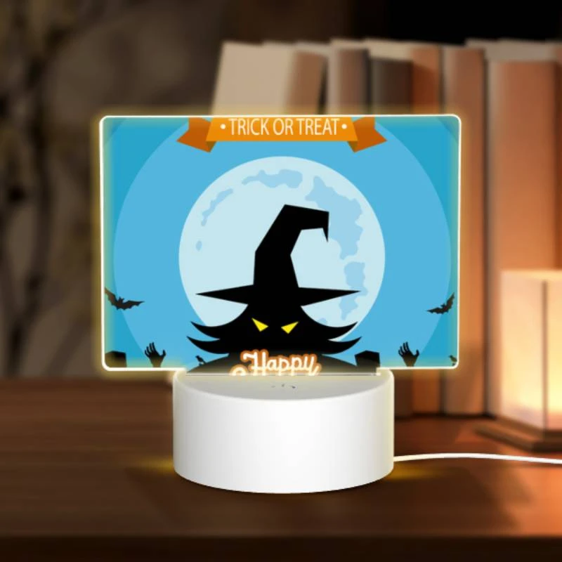 Rectangular Acrylic Night Light, A Witch’s Hat Is Shown On A Poster With The Words “Happy Halloween” Written Below It.