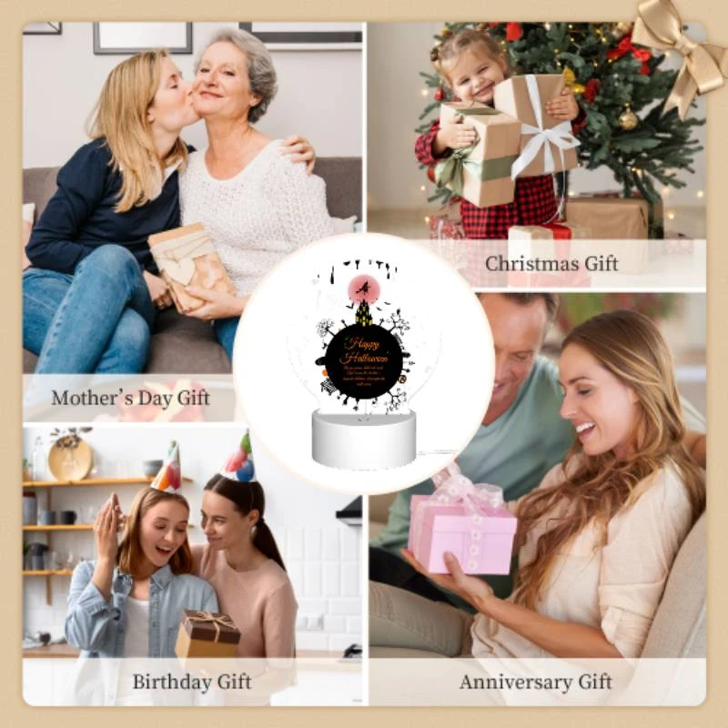 Round Acrylic Night Light, A Black And White Poster With A Witch On A Broomstick And The Words “Happy Halloween” Written In Orange.