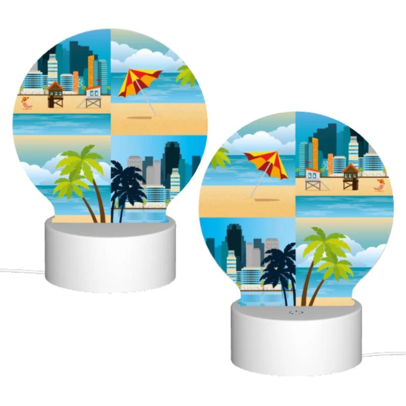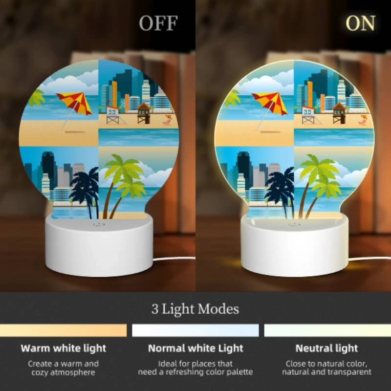 Round Acrylic Night Light, A Cityscape With A Beach And Palm Trees.