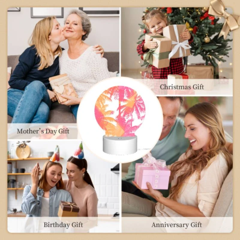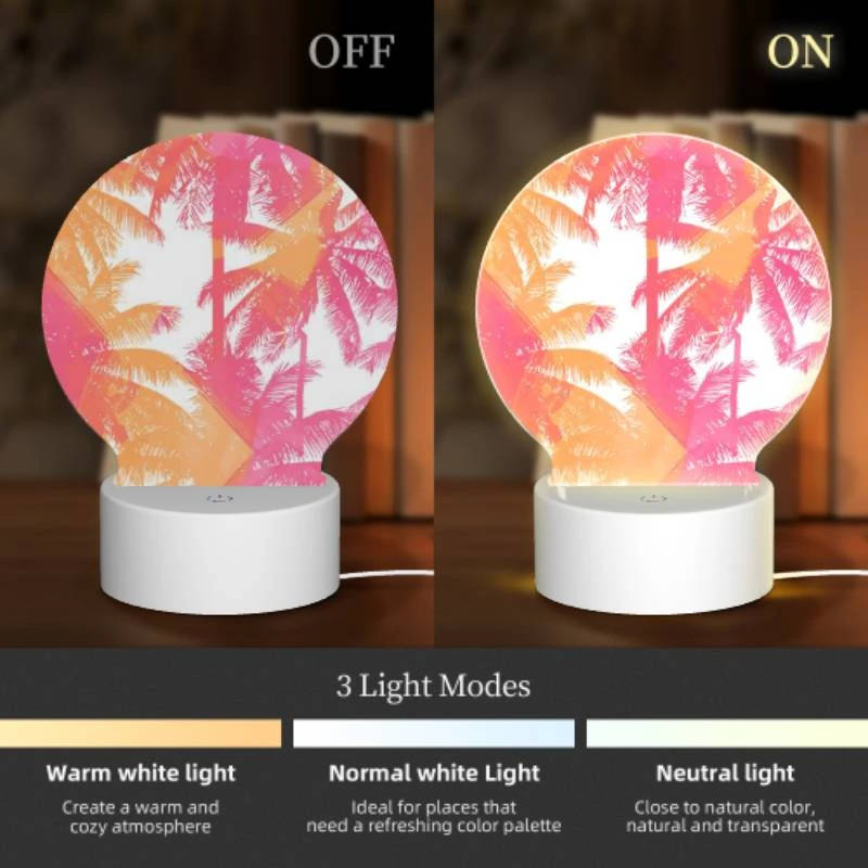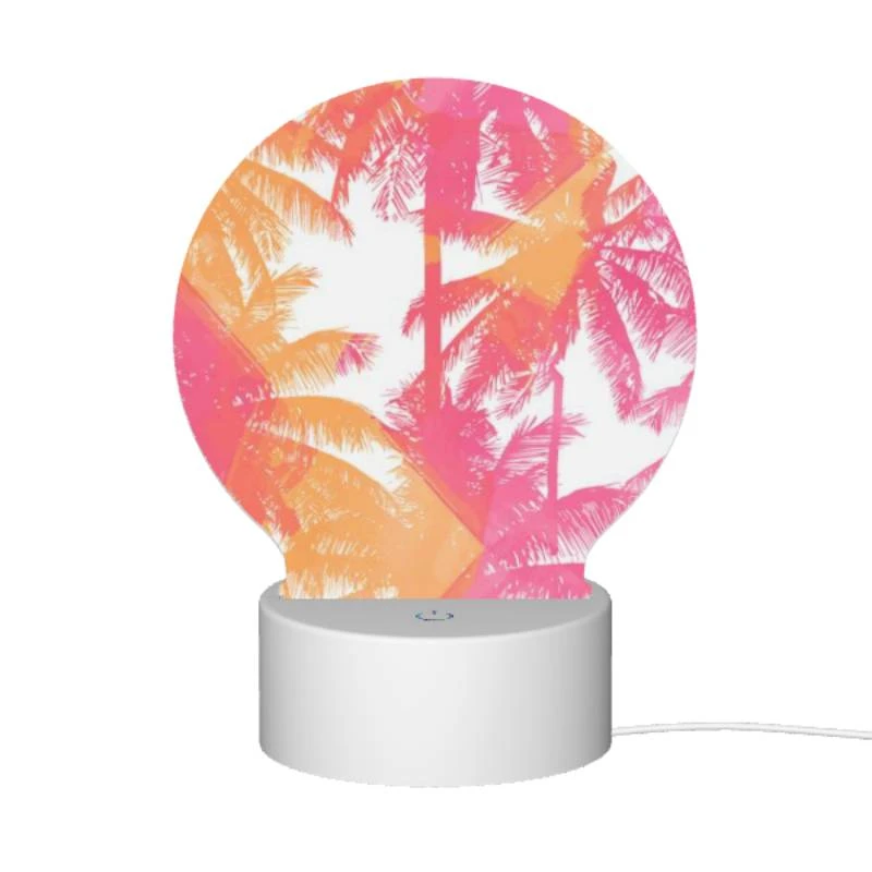 Round Acrylic Night Light, A Colorful Palm Tree With Pink And Orange Hues.