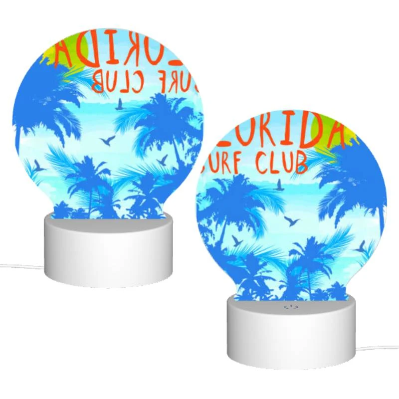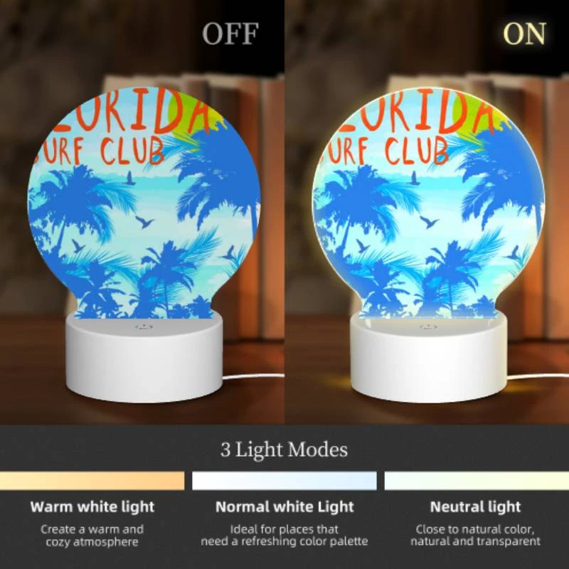 Round Acrylic Night Light, A Colorful Surf Club Poster With A Blue And Orange Background.
