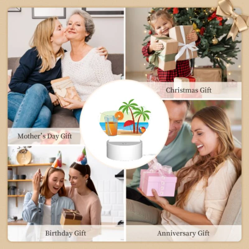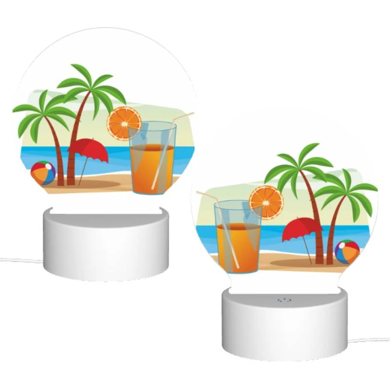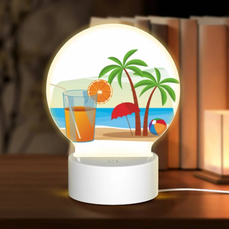 Round Acrylic Night Light, A Glass Of Orange Juice And An Orange Are Placed On A Beach
