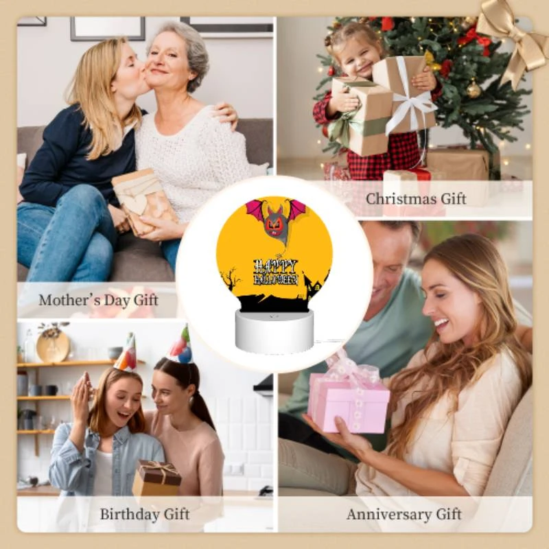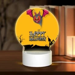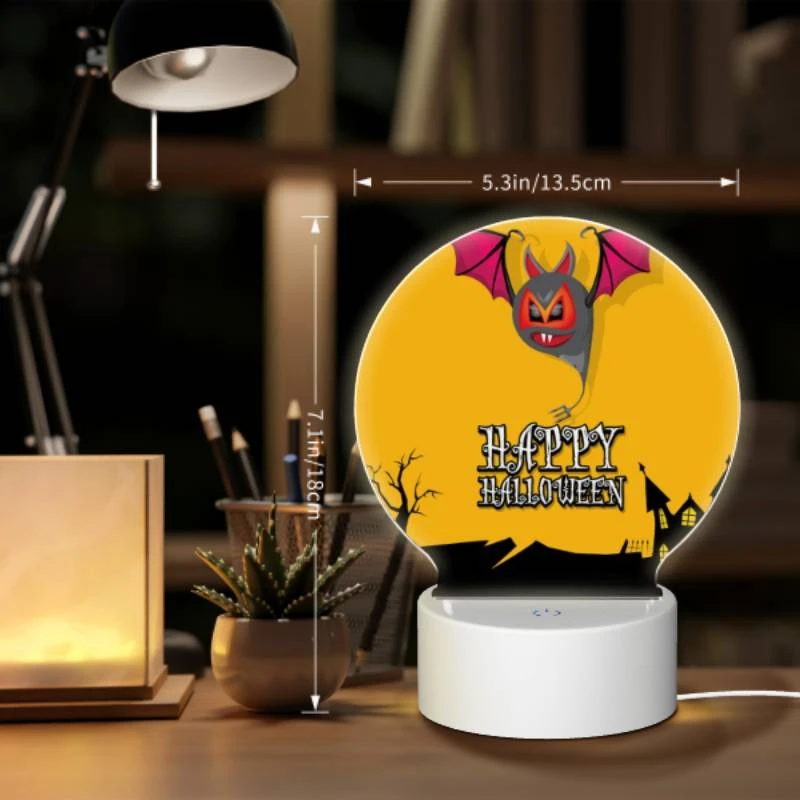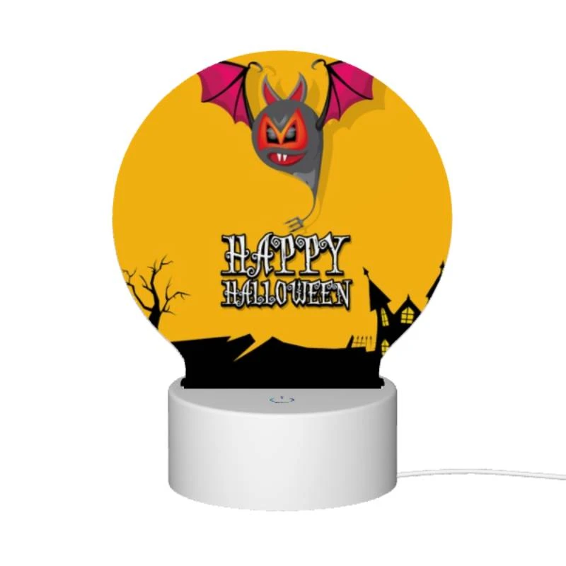 Round Acrylic Night Light, A Halloween Banner With A Bat And A Pumpkin.