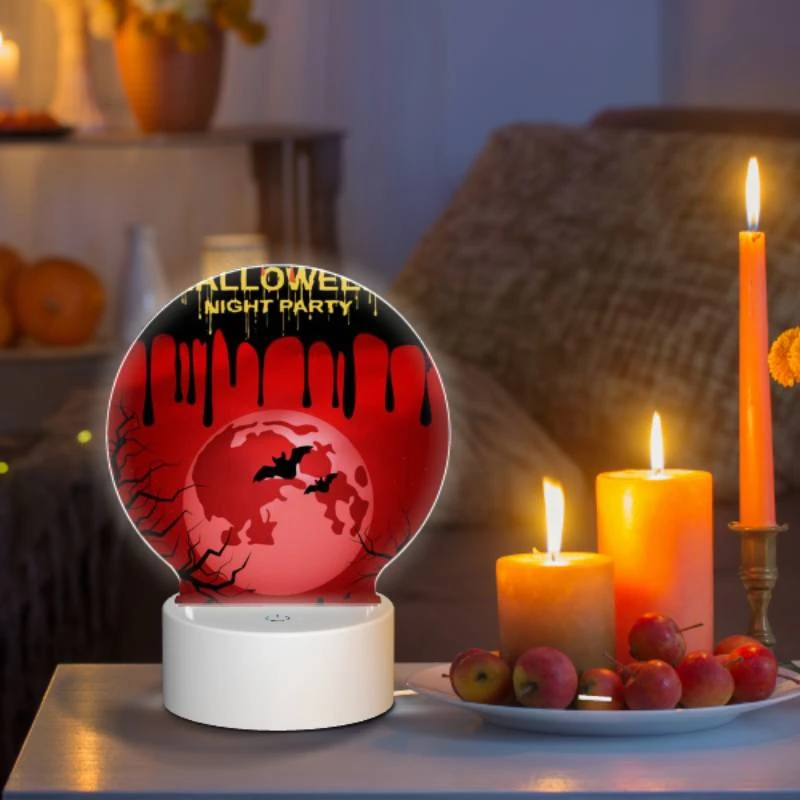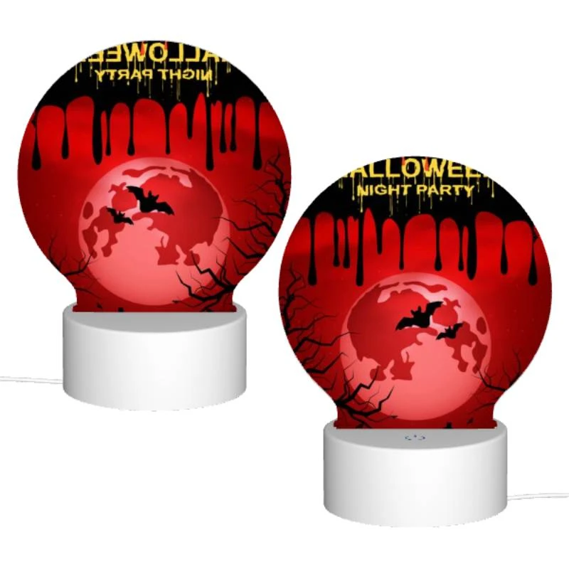 Round Acrylic Night Light, A Halloween Night Party Poster With A Red Moon And Bats.