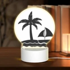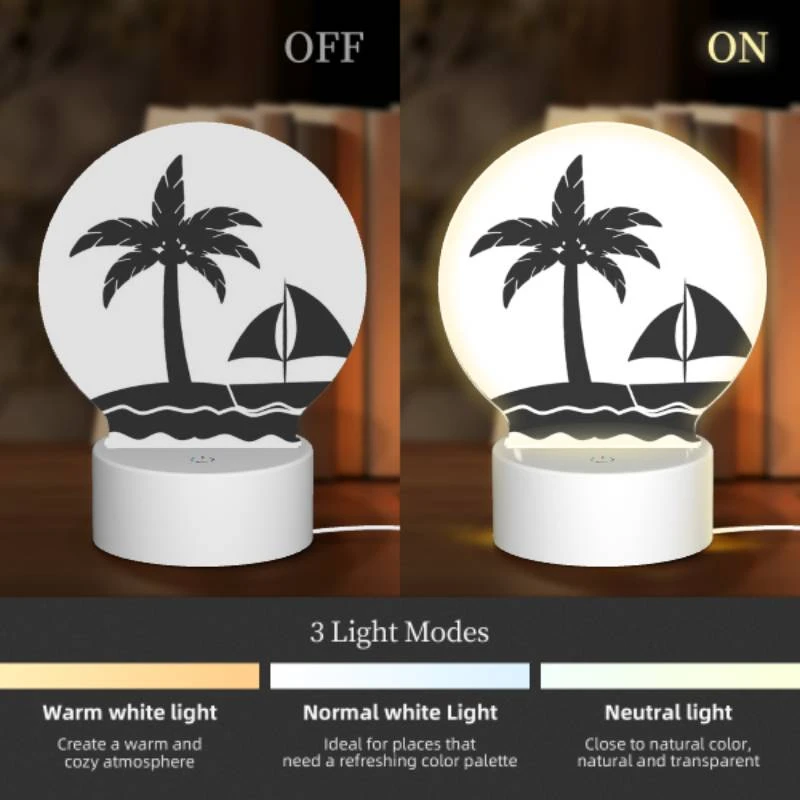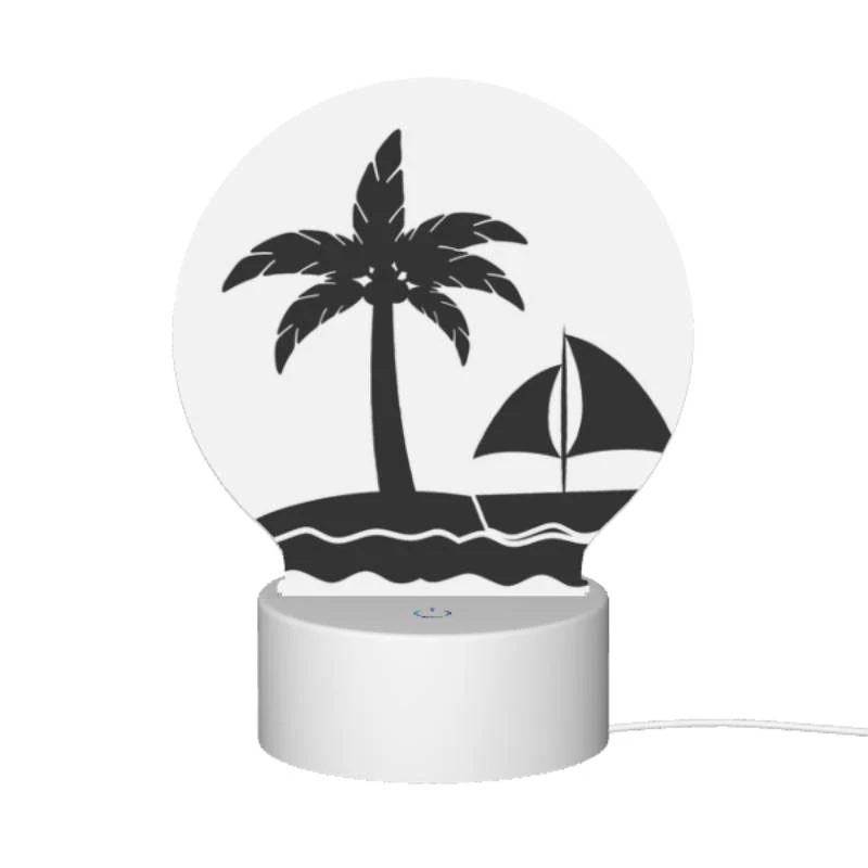 Round Acrylic Night Light, A Sailboat Is In The Water Near A Palm Tree.