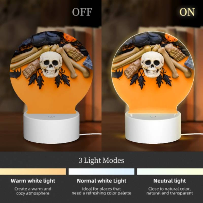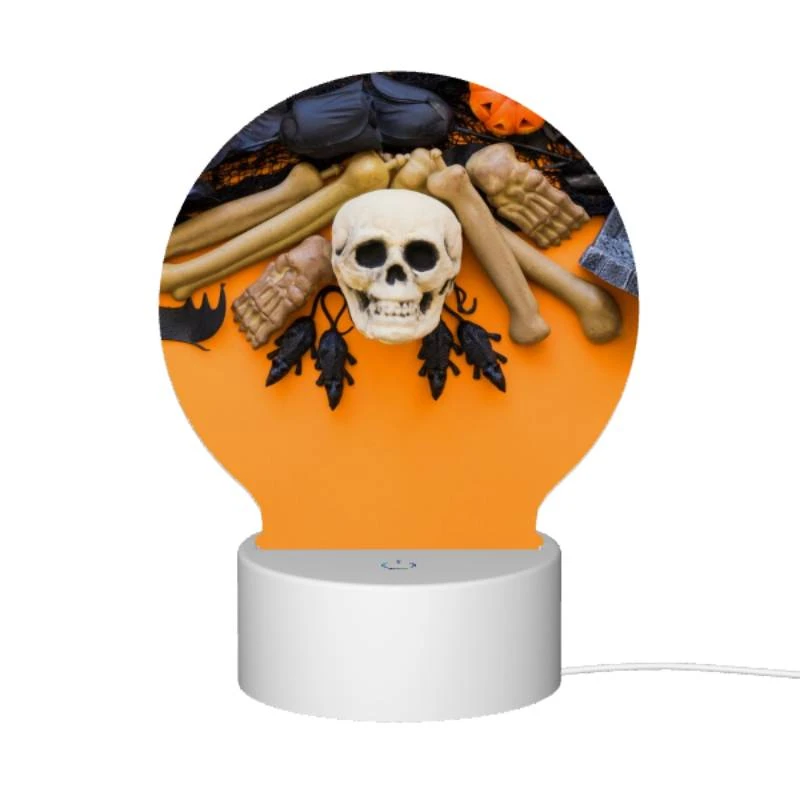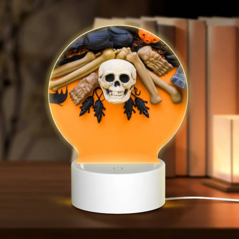 Round Acrylic Night Light, A Skeleton And A Skull Are On A Table With A Bat And A Book.