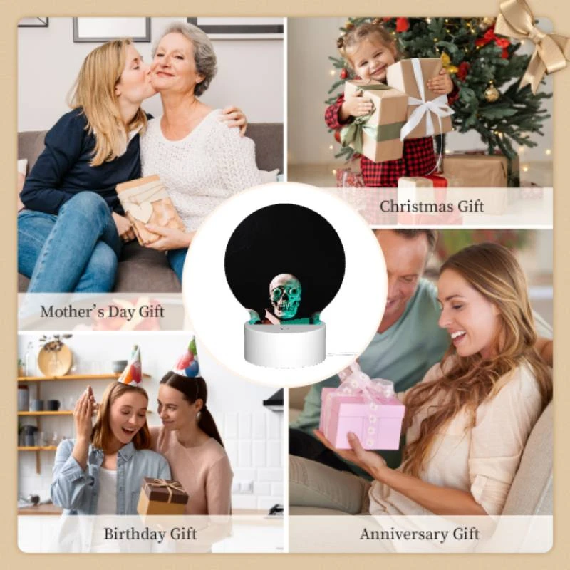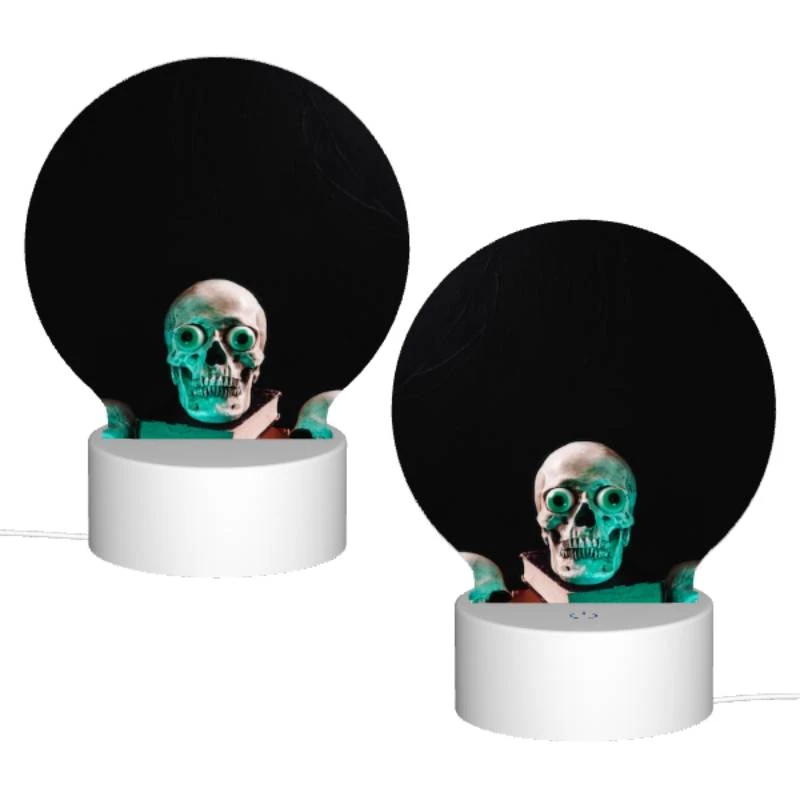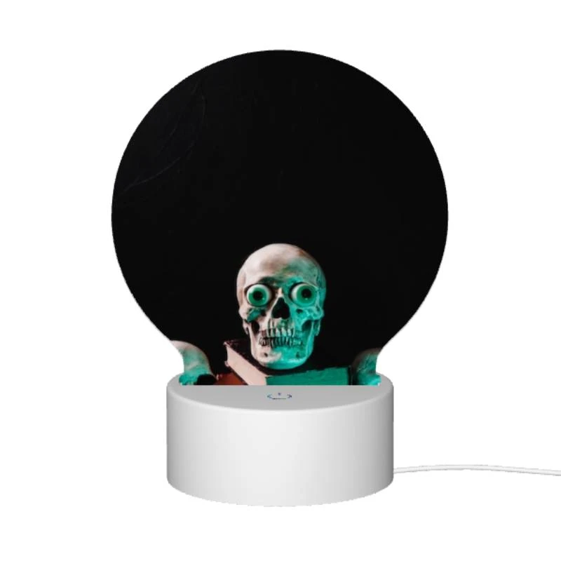 Round Acrylic Night Light, A Stack Of Books With A Skull On Top.