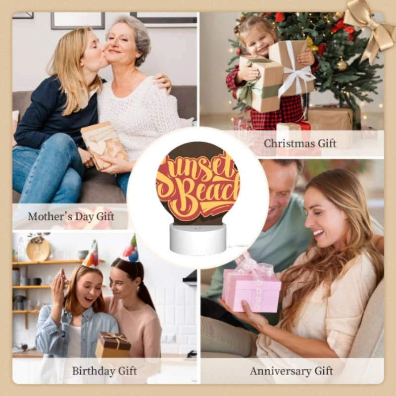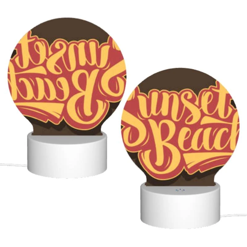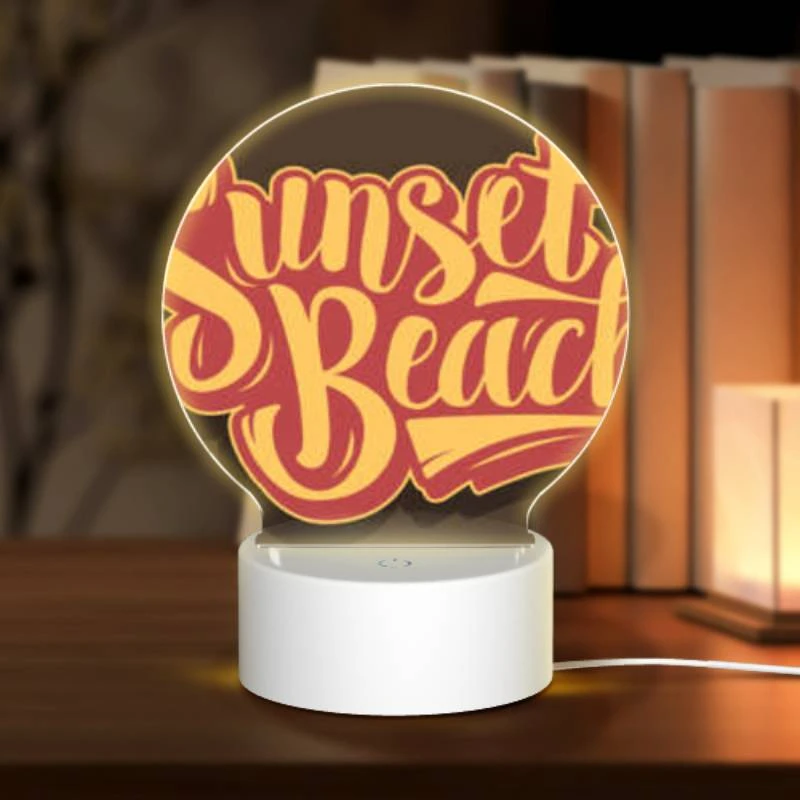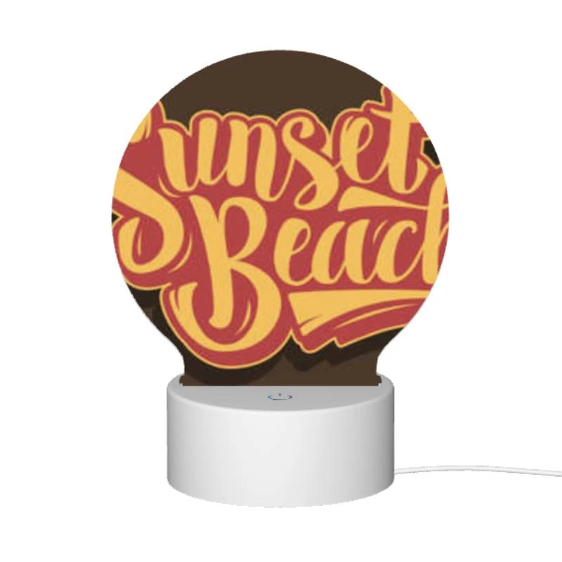Round Acrylic Night Light, A Sunset Beach Sign With Yellow Letters.