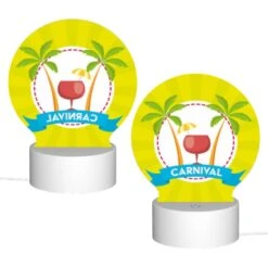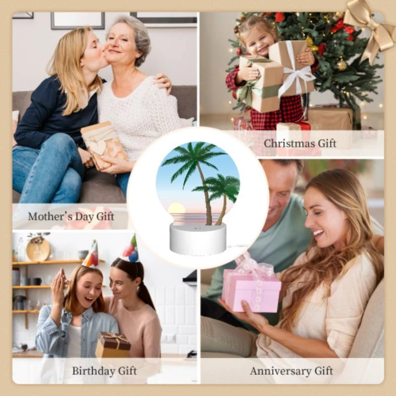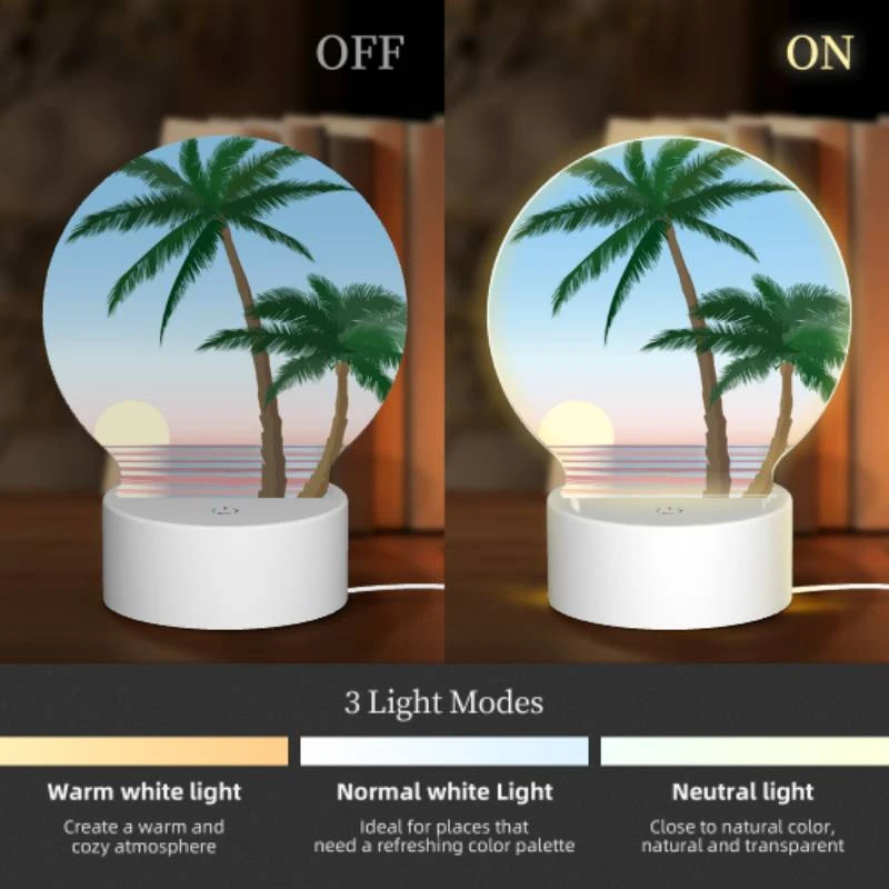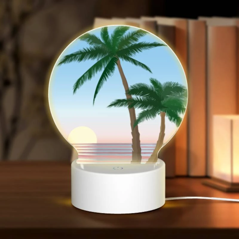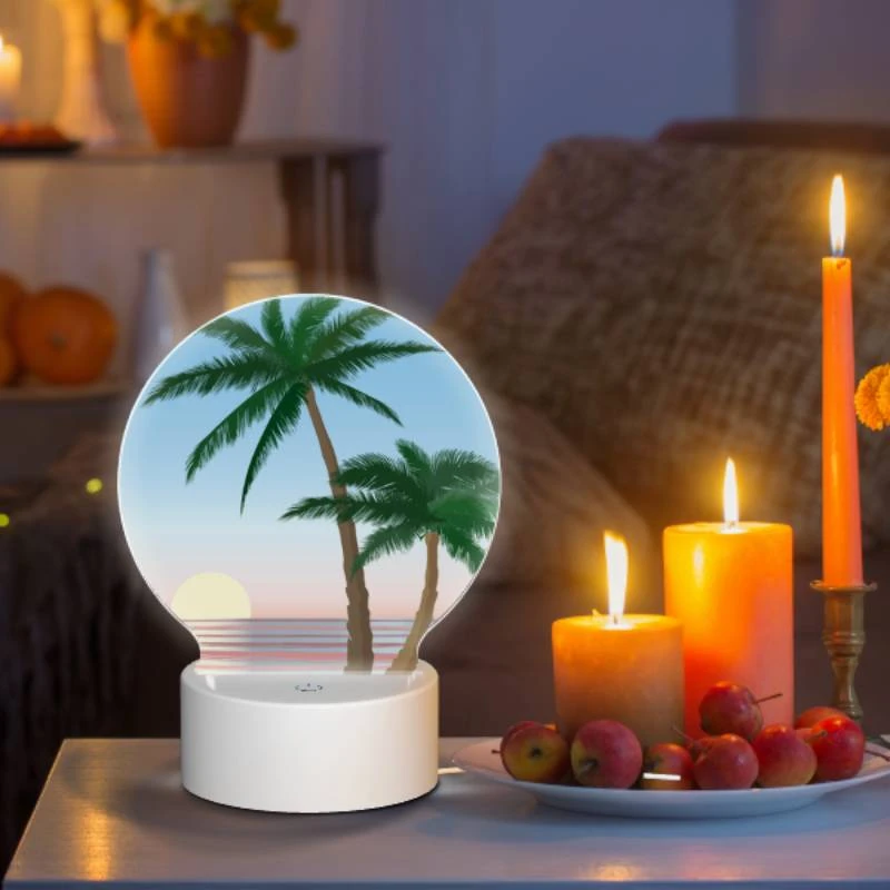 Round Acrylic Night Light, A Sunset With A Palm Tree And A Beach.