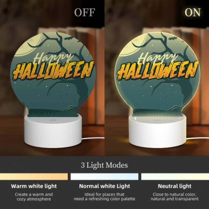 Round Acrylic Night Light, A Tree With A Spooky Halloween Sign On It.