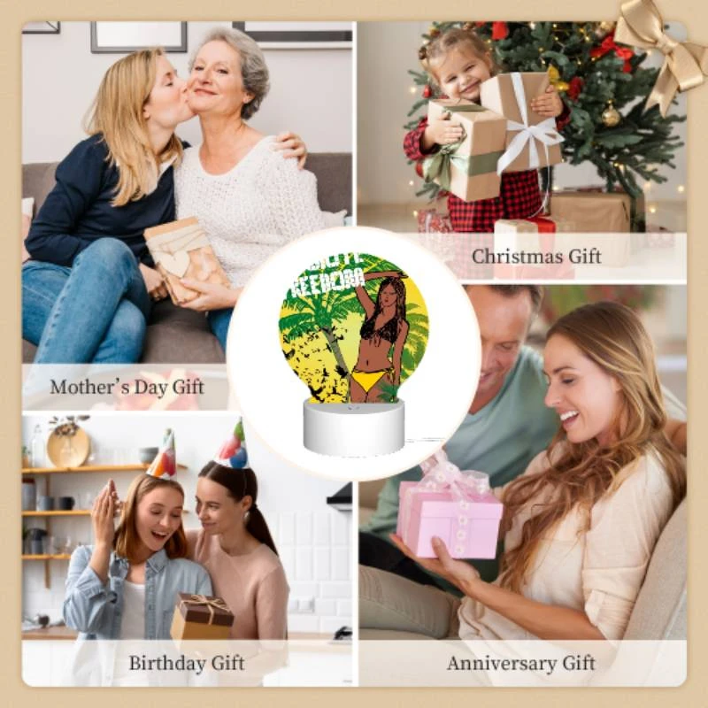 Round Acrylic Night Light, A Woman With A Yellow Bikini Is Standing In Front Of A Tree With Birds Flying Around Her.