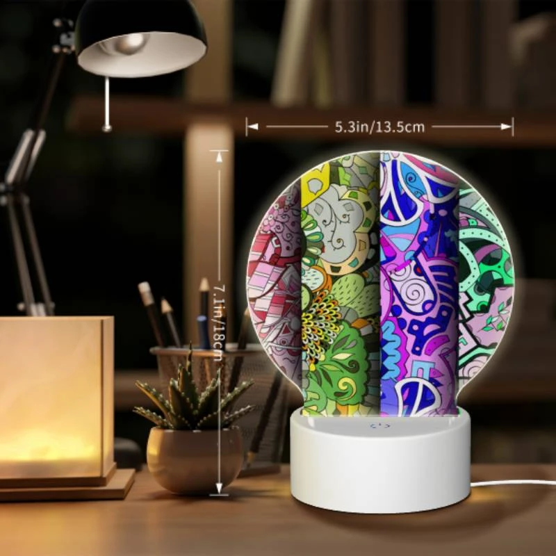 Round Acrylic Night Light, A Colorful Abstract Design Is Displayed On A White Background.