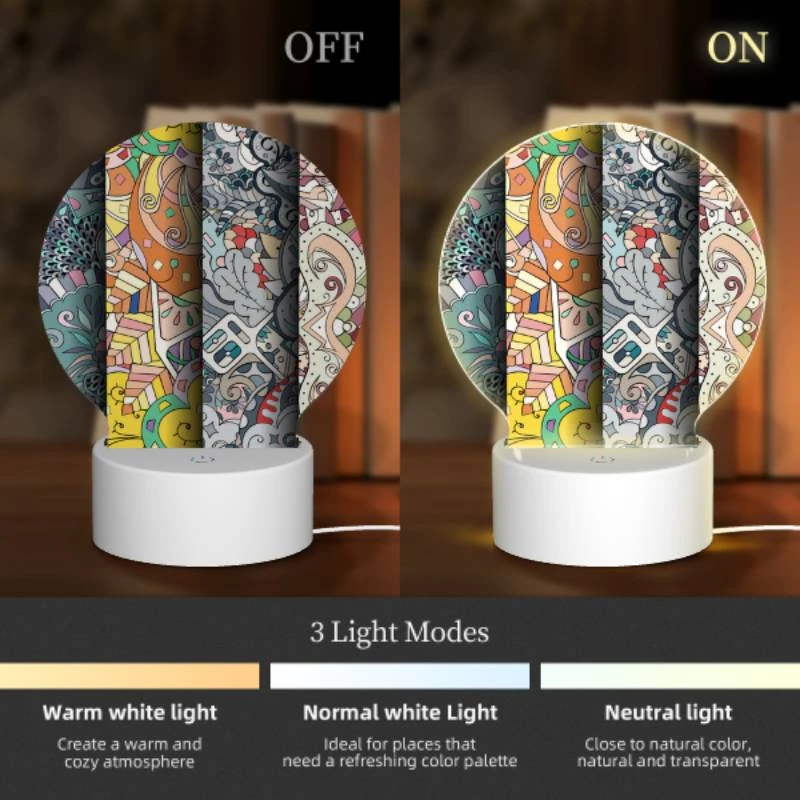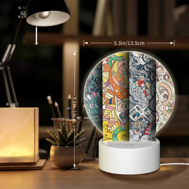 Round Acrylic Night Light, Four Different Colored Paintings Of Swirls And Designs.