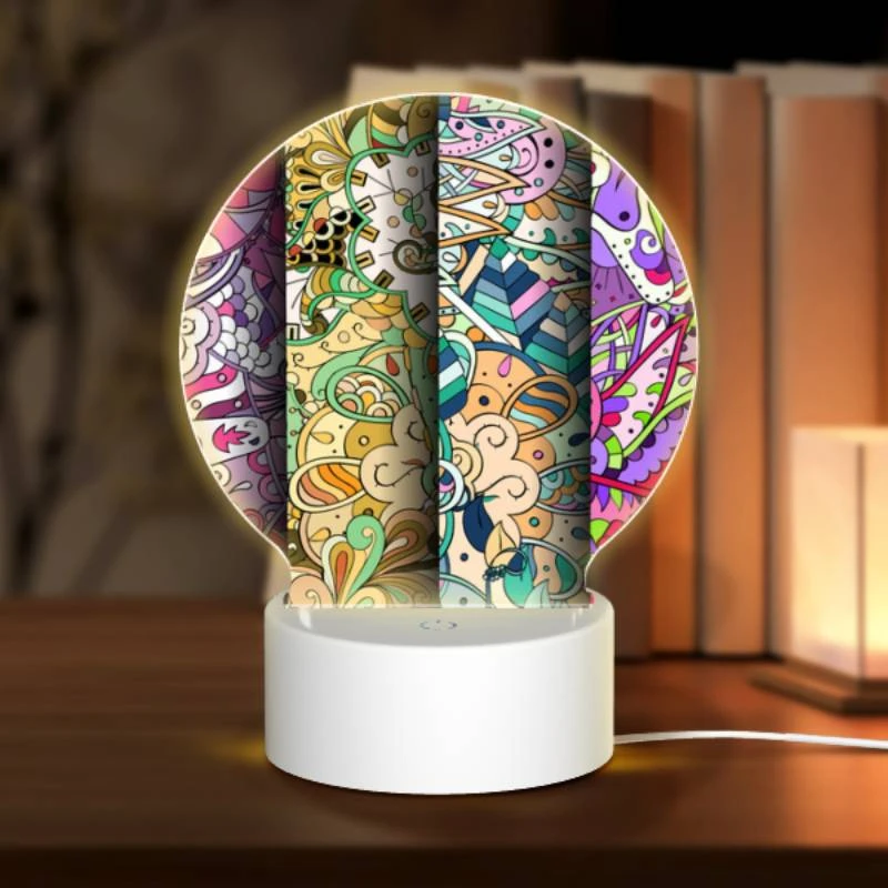 Round Acrylic Night Light, Three Colorful And Intricate Designs Are Displayed On A Row Of Paper.